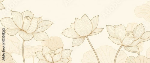 This elegant floral wallpaper features lotus flowers, leaves, and buds in a minimalistic linear style.