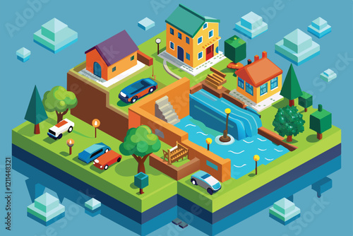 This illustration depicts a colorful neighborhood impacted by flooding, featuring houses, cars, and a stream Flood Customizable Isometric Illustration