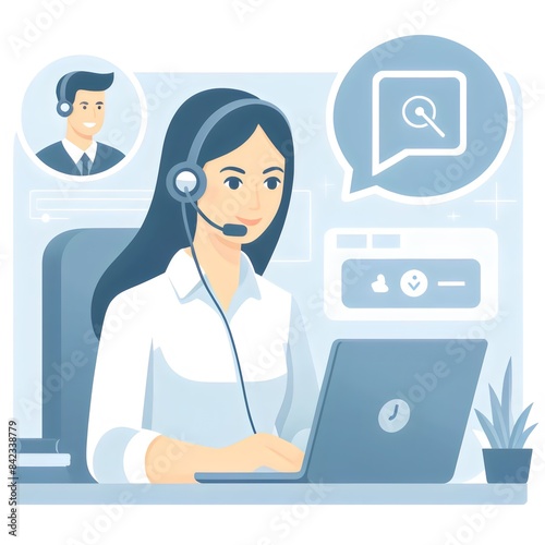 This illustration portrays a serene and focused female customer service representative. She is depicted working diligently at her computer