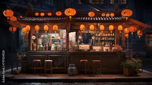 This image highlights a lively Asian food stand, adorned with glowing lanterns, serving local delicacies at night