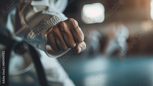 This image highlights a martial artist's fist in focus, capturing the intensity and concentration of a practice session, with other participants blurred in the background for emphasis.