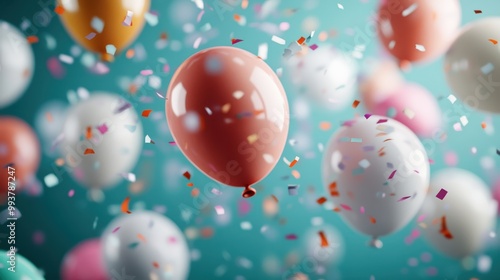 This image shows colorful balloons floating against a vibrant background with confetti, perfect for celebrations and special occasions.