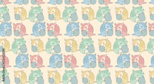 This is a delightful cartoon pattern of pastel-colored armadillos hugging stones, set against a light beige background, perfect for children's products.