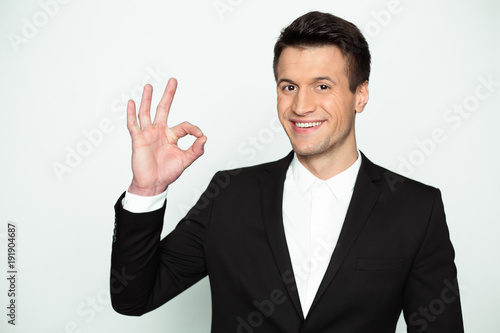 This is a good result. Stylish handsome smiling modern businessman in smart casual wear looks at the camera and picks up his thumb up.