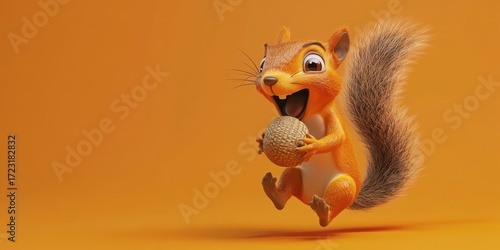 This lively cartoon squirrel bursts with joy while holding an acorn, capturing playful energy against a bright orange backdrop, perfect for vibrant visuals.