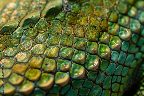 This photo showcases a detailed close-up view of the textured green skin of a lizard, A high detailed view of a lizard's skin, AI Generated