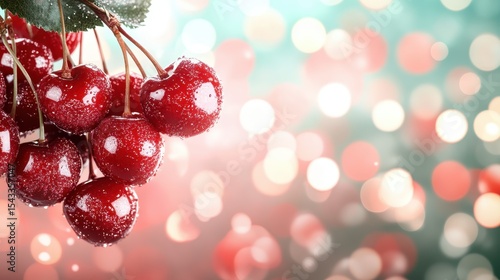This vibrant image showcases glittering cherries sitting against a blurred backdrop, enhancing its allure and capturing the essence of freshness and indulgence.