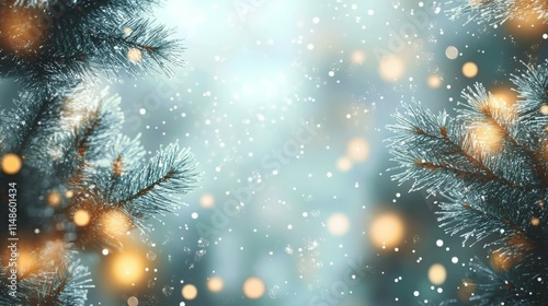 This winter scene showcases sparkling bokeh lights intertwined with lush green pine branches, creating a warm, cheerful holiday atmosphere that delights the soul and elevates the festive spirit