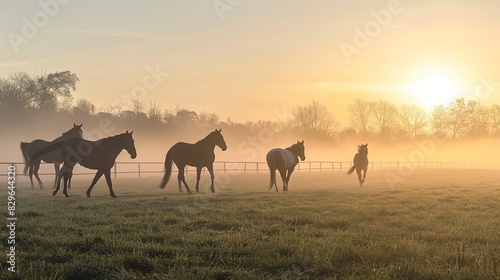 Thoroughbred horses grazing at sunset in a field