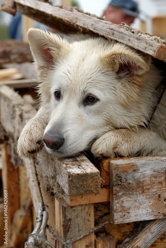 Thoughtful Dog Resting on Wooden Structure – Dog House Repair Month
