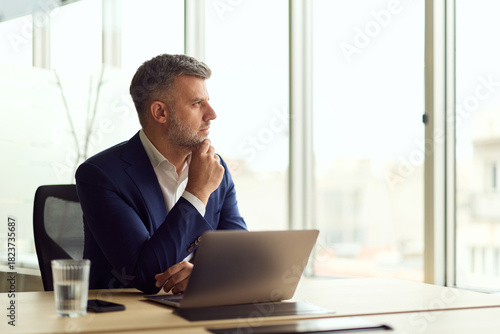 Thoughtful Professional in Navy Suit at Modern Office with Laptop and Desk
