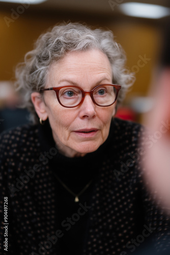 Thoughtful Senior Woman with Red Glasses and Polka Dot Blouse, Serious Expression in Studio Setting, Contemplative Portrait