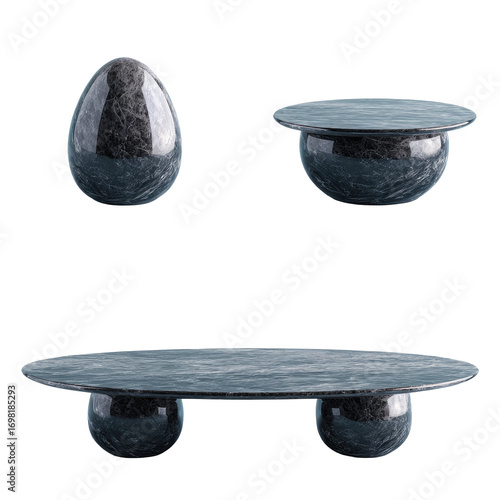 Three abstract marble objects. A dark grey, veined marble egg, a shallow, lidded bowl, and a long, oval, low table supported by two rounded bases
