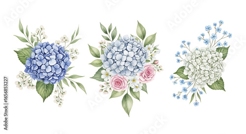 Three Beautiful Hydrangea Flower Bouquets with Roses and Delicate Foliage Arrangement