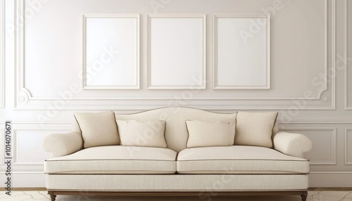 Three blank white picture frames hanging on the wall of an elegant living room with a beige sofa, modern interior design