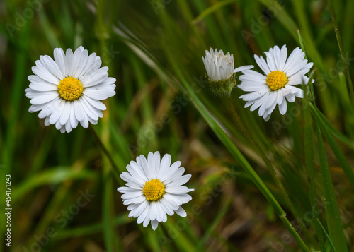 three blossoms of white common, lawn, or English daisy, bruisewort, or woundwort (Bellis perennis)