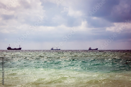 three cargo ship on the horizon in the sea. cloudy sky