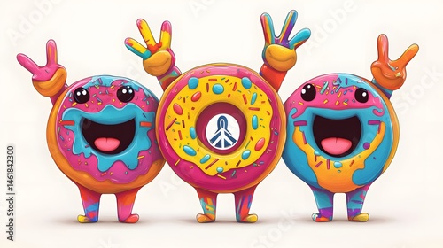 Three cheerful donut characters with peace symbol.