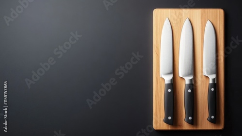Three Chef Knives on Wooden Cutting Board with Dark Background