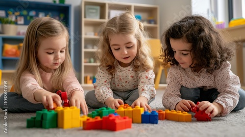 Three children playing with colorful building blocks on the floor, engaging in creative development and teamwork in a cozy playroom.