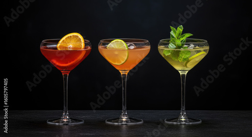 Three Colorful Cocktails in Coupe Glasses.