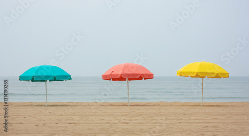 Three colorful umbrellas arranged symmetrically on sandy beach ocean shore minimalistic seaside relaxation