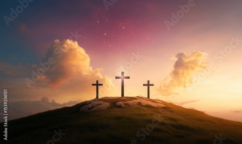 Three crosses stand atop a lush hill as the sun sets, casting warm hues across the sky. Abstract glittering effects create a serene and contemplative mood in this tranquil landscape