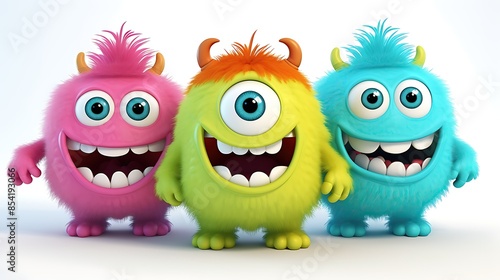 Three cute and colorful monsters are standing in a row. They have big eyes, sharp teeth, and are covered in fur.