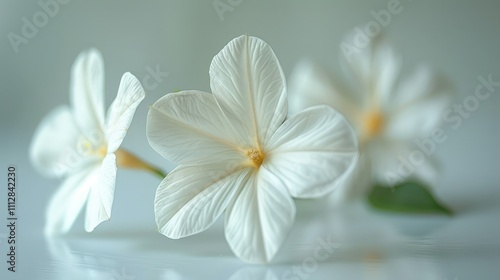 Three delicate white flowers with subtle yellow centers, softly lit against a light gray background.
