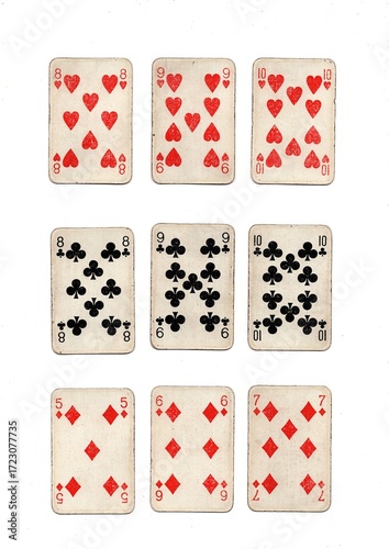Three different hands of grubby vintage playing cards isolated on a white background.