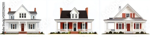 Three distinct styles of Colonial Revival house style, showcasing variations in architecture. The first house features a classic design with a gabled roof and front porch.