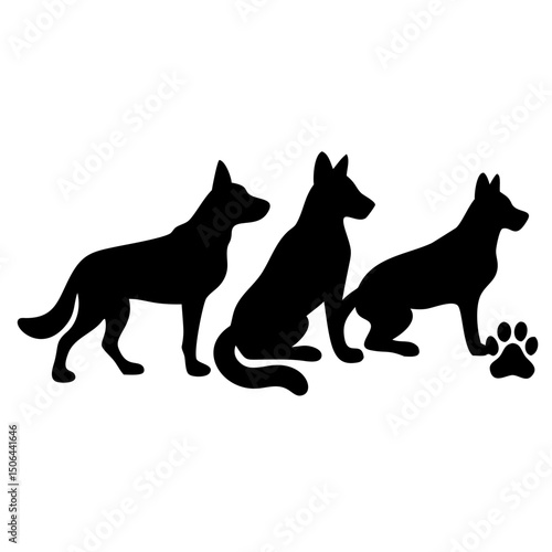 Three dog silhouettes isolated on white background with paw print