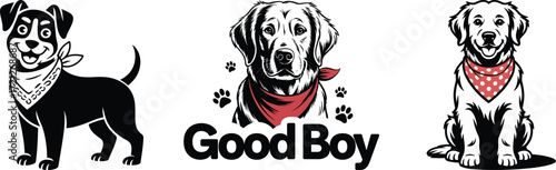 Three dogs with bandanas in a row on a white background