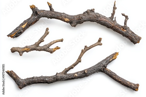 Three dry branches with rough bark are arranged on a white background