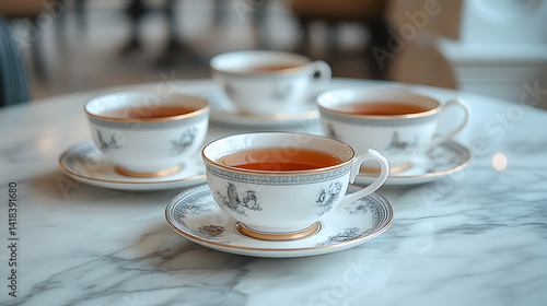Three elegant teacups filled with amber tea, sitting on a marble table. A sophisticated scene perfect for relaxation and luxury themes.