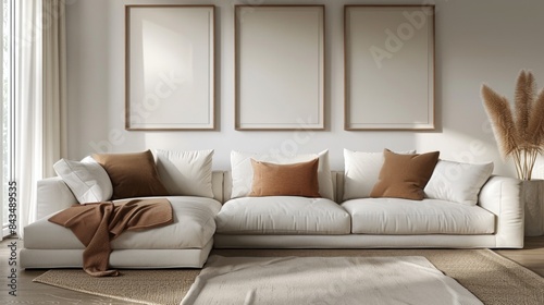 Three empty vertical picture frames above a white sofa with cushions in a modern living room with neutral tones.