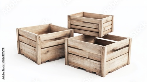 Three empty, wooden crate boxes are arranged on a white background, with two boxes stacked on top of each other, and the third box placed to the right, slightly offset