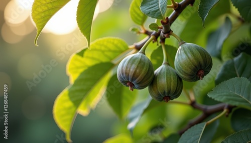Three figs hanging from a branch with green leaves, bathed in soft sunlight. Figs are symbolic fruits for Rosh Hashanah, the Jewish New Year