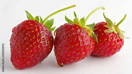 Three fresh, juicy strawberries, glistening with water droplets, sit in a row against a plain white background. They are plump, bright red, and show tiny seeds