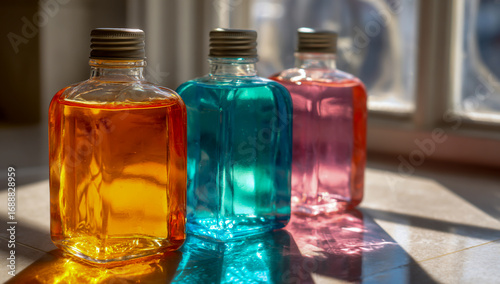 Three glass bottles filled with colorful liquids in orange blue and pink illuminated by sunlight