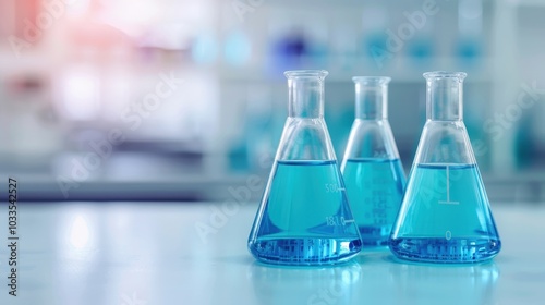 Three glass flasks containing blue liquid on a laboratory bench, representing scientific experimentation and analysis.