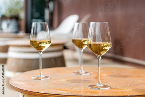 Three glasses of white wine set out on a table.