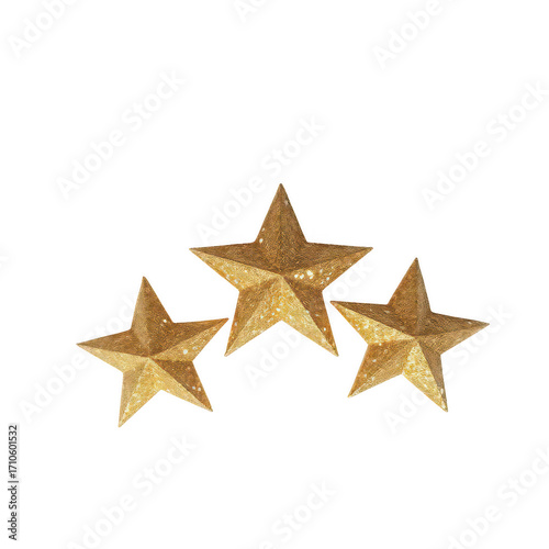 Three golden glitter stars isolated on transparent background