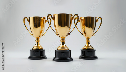 Three Golden Trophies Symbolize Victory Achievement Success on a clean white