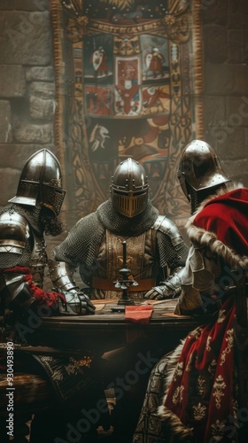 Three knights in armor celebrate around a table. Central knight in gold helmet holds a wine cup, while others look on. Table set with cups, plates, and medieval backdrop.