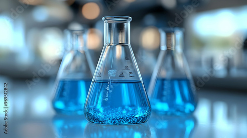 Three laboratory flasks filled with blue liquid, representing scientific experimentation.