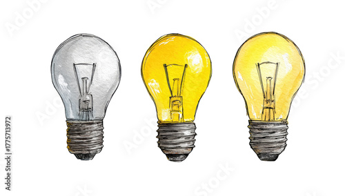 Three light bulbs, one white, two yellow, illustration