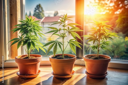 Three luscious home-grown cannabis plants in a small flower pot sit on a sunny window sill, surrounded by natural light and a serene home atmosphere.