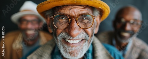 Three men of different ages and ethnicities pose for a portrait, all smiling