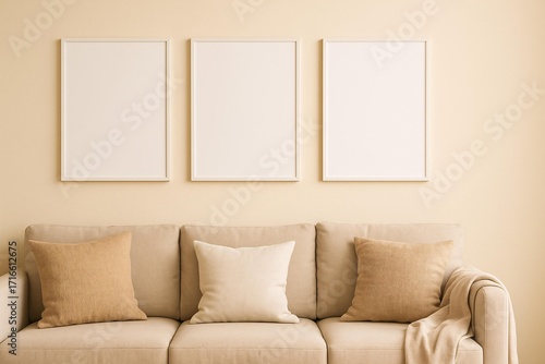 Three Minimalist Blank Frames Above Neutral Sofa in Cozy Living Room